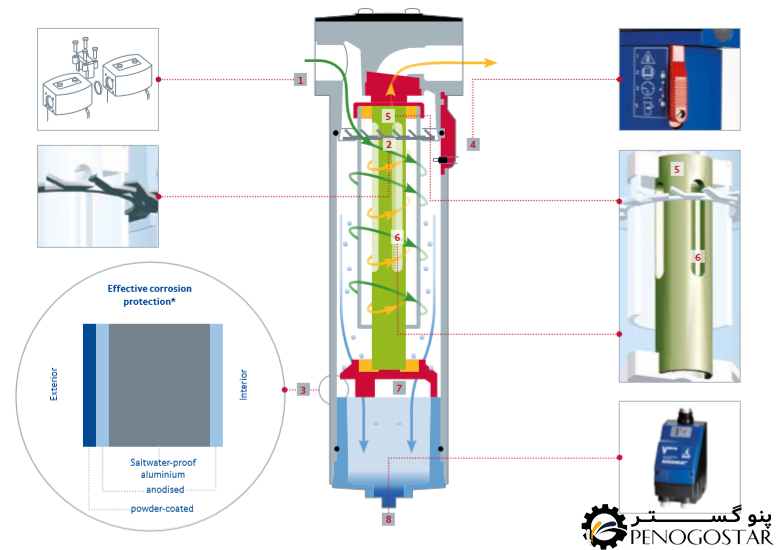 رطوبتگیر با استفاده از نیروی گریز از مرکز، رطوبت موجود در هوای فشرده را جدا میکند. اما این رطوبت درون دستگاه جمع میشود و باید بهطور منظم تخلیه شود. دو روش برای این کار وجود دارد: